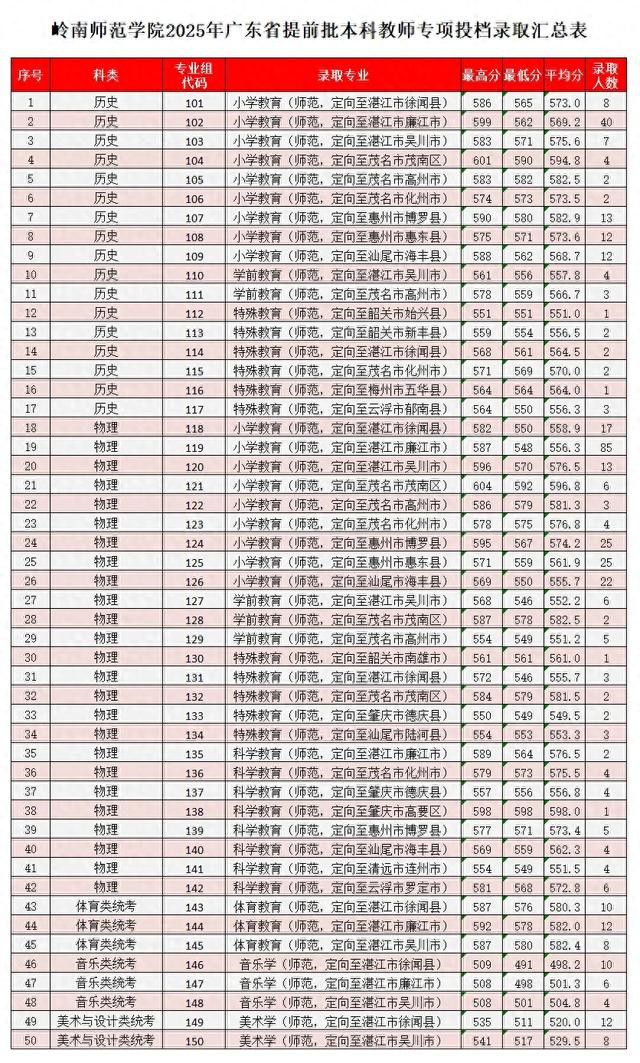 广东省2025年本科提前批教师专项计划于7月12-13日正式投档。我校2025年公费定向师范生报考热度持续攀升,录取分数全线飘红,生源质量再创新高。其中普通批物理历史类考生最高分双双超600分;物理类最低排位较去年提升约1.5万名;历史类最低排位较去年提升约6千名;艺体类各招生专业最低排位均有不同幅度提升。我校的公费定向师范生投档情况具体如下:普通类(历史)计划118人,投档118人,录取118人,录取最高分601分,特殊类型招生录取控制线上113人,录取最低分550分;普通类(物理)计划254人,投档254人,录取254人,录取最高分604分,特殊类型招生录取控制线上254人,录取最低分546分。体育类计划30人,投档30人,录取30人,最高投档分592分,最低投档分576分;美术类计划20人,投档20人,录取20人,最高投档分541分,最低投档分511分;音乐类计划20人,投档20人,录取20人,最高投档分509分,最低投档分491分。广东教师专项计划实行“分数优先”原则投档,根据学校招生章程的录取原则,提前批教师专项计划普通类专业按考生投档总分排位情况从高到低录取。各专业投档录取详情见下表。